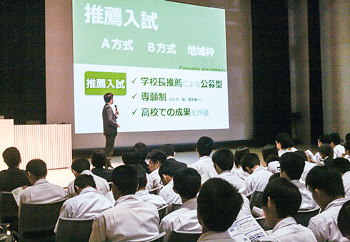 地元の私立大学を中心に複数の大学から講師をお呼びし、合同説明会を行っています。また、令和5年度からは、関東・関西の私立大学からも講師をお招きし進学意識を高めます。